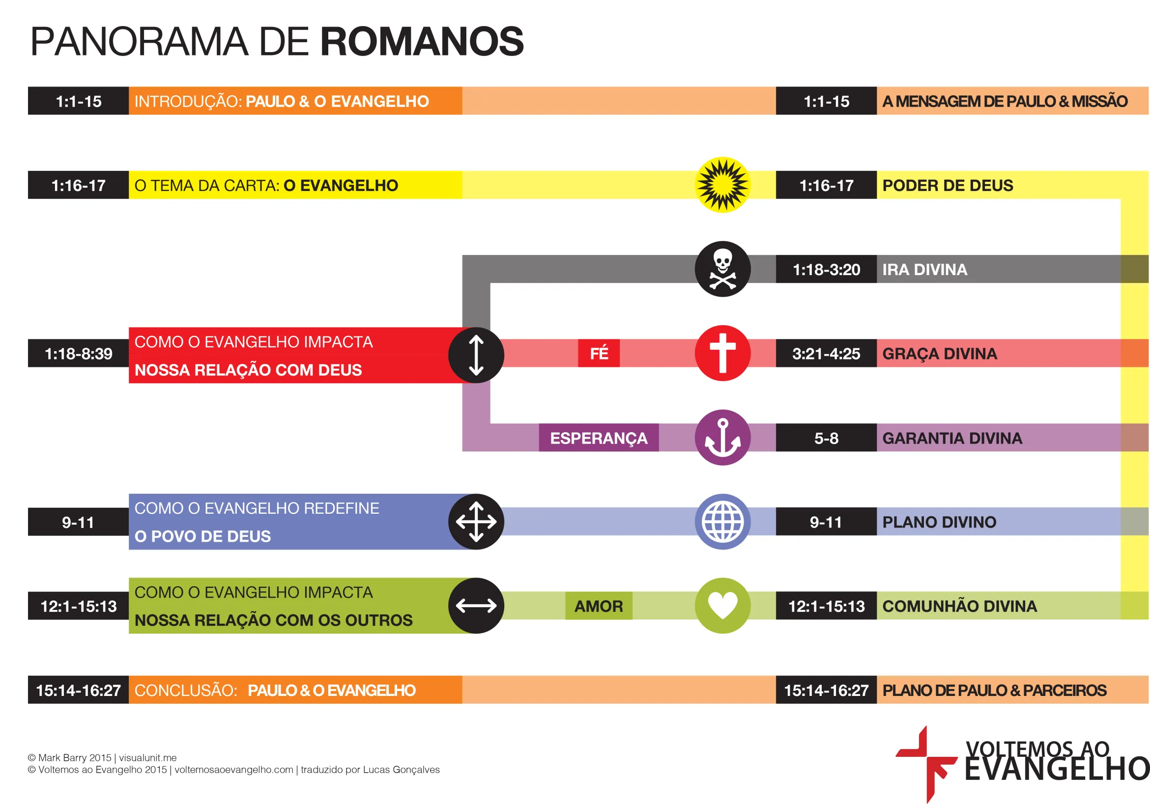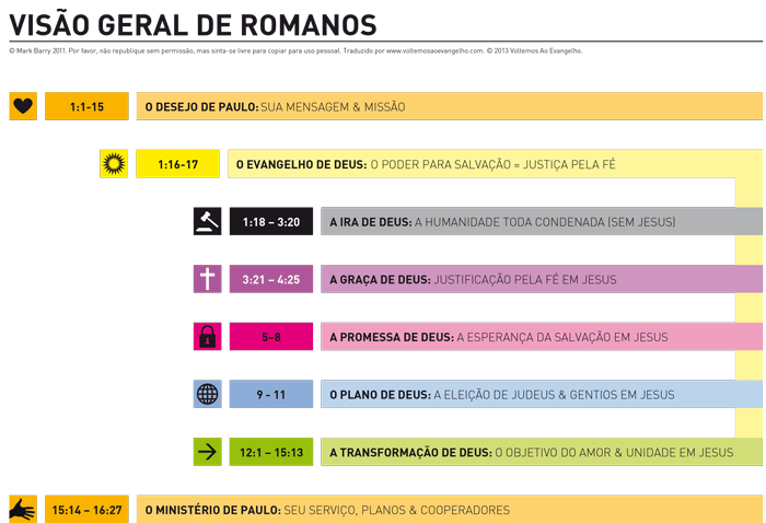 Em Romanos, apresenta de forma sistemática o evangelho: todos pecaram, mas a salvação é pela graça mediante a fé; fala da vida no Espírito, da eleição de Israel e da prática cristã.